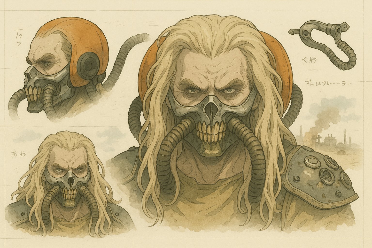Transform this image into a stylized mechanical design sheet inspired by Japanese anime mecha blueprints. Render the subject with precise, clean linework and semi-realistic cel-shading, as if it were a technical illustration from an anime artbook. Break down the design into parts (e.g., head, hand, accessory, full body) and arrange them like a reference sheet, with different angles and views. Include soft handwritten notes or Japanese characters scattered like concept annotations. Use muted digital colors (red, gray, metallic tones) and draw the background in a loose watercolor anime landscape style — cliffs, cityscapes, or grassland ruins. The final composition should feel like an an "official design page" for an animated sci-fi series or manga. Keep the format horizontal, like a blueprint or character sheet, with a balance between precision and artistic flair.