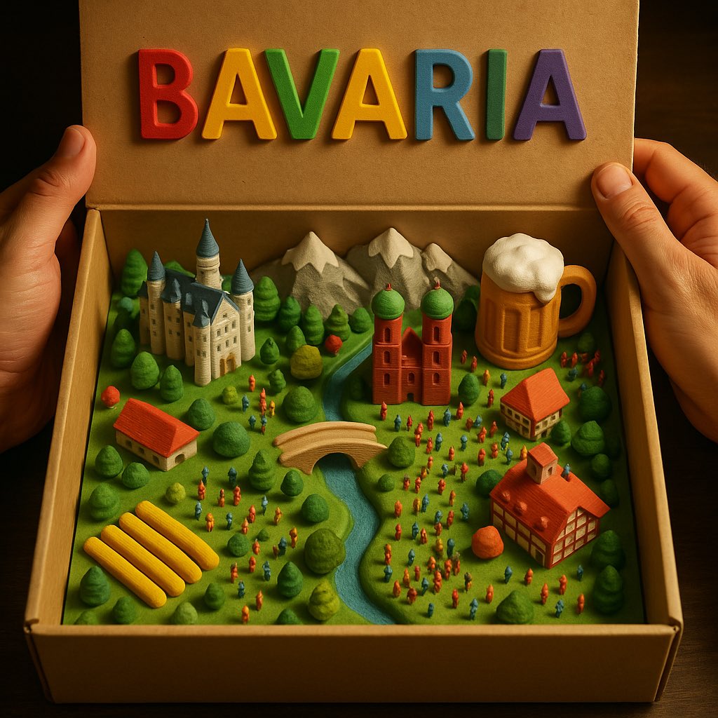 An ultra-realistic top-down photograph of a 3D-printed diorama inside a beige cardboard box, with the lid being held open by two human hands. The interior of the box reveals a miniature landscape of [COUNTRY NAME], featuring iconic landmarks, terrain, buildings, rivers, vegetation, and crowds of tiny, detailed human figures. The diorama is filled with vibrant, geographically appropriate elements, all crafted in a tactile, toy-like style using matte 3D-printed textures with visible layer lines. At the top, the inside of the box lid displays the phrase "[COUNTRY NAME]" in large, colorful, raised plastic letters—each letter in a different bright color. The lighting is warm and cinematic, highlighting the textures and shadows to evoke a sense of realism and charm, as if the viewer is opening a magical miniature version of the nation.
